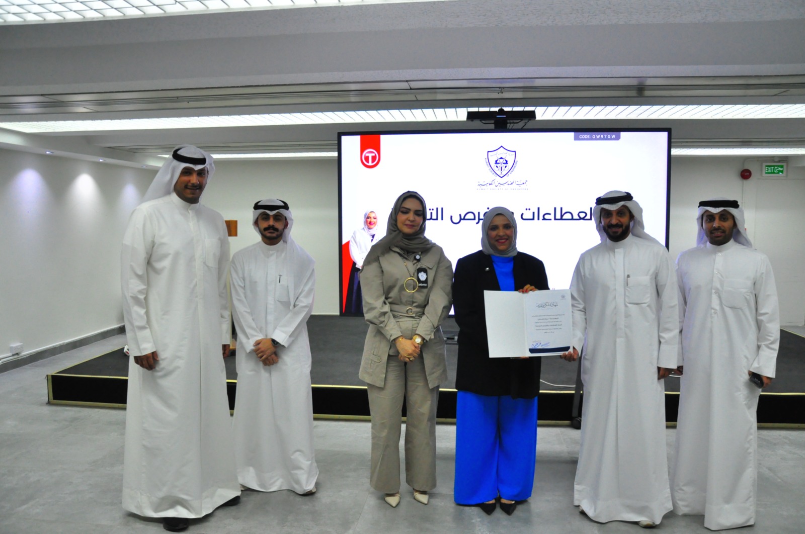 في ختام المحاضرة قام نائب مدير عام الجمعية المهندس شبيب الزعبي ونائب رئيس لجنة المهندسات المهندسة ريم السعيد ، ومقرر اللجنة الثقافية المهندس خالد الجبيران وعضوي اللجنة المهندس حمود المطيري وعبد الله العازمي ، بتقديم شهادة تقدير وشكر للمحاضرة على جهودها وتعاونها مع الجمعية.