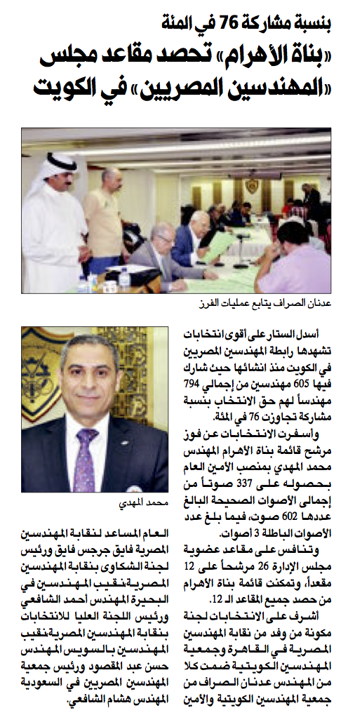 جريدة الراي 30/05/2016 أخبارنا بالصحف Tags: جريدة الرايجمعية المهندسين الكويتيةم. أحمد الشافعيم. حسن عبدالمقصودم. عدنان الصرافم. فايق جرجسم. محمد المهدىم. هشام الشافعي Share 0
