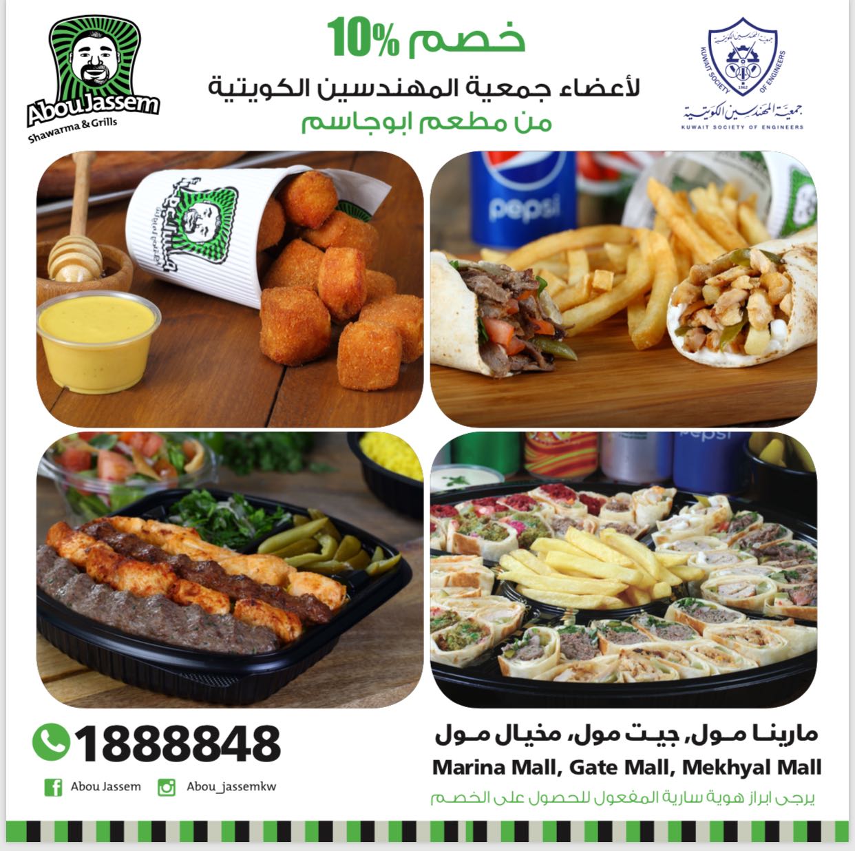 خصم خاص لأعضاء جمعية المهندسين الكويتية من مطعم ابوجاسم 31/01/2018 الإعلانات الرئيسية, العروض و الخصومات Tags: جمعية المهندسين الكويتية Share 40