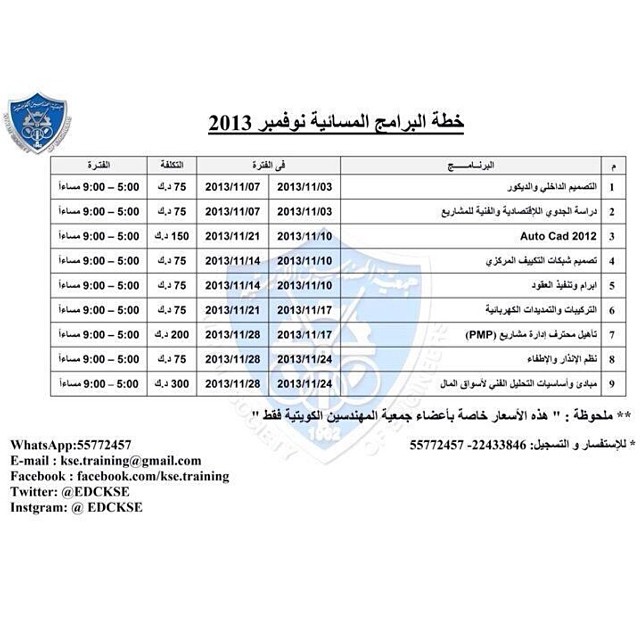 خطة البرامج المسائية نوفمبر ٢٠١٣ 26/10/2013 الإعلانات الرئيسية, البرامج التدريبية Tags: جمعية المهندسين الكويتيةمركز التدريب Share 0