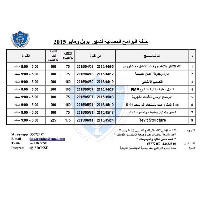 خطة البرنامج المسائية لشهر إبريل ومايو 2015 29/03/2015 الإعلانات الرئيسية, البرامج التدريبية Tags: جمعية المهندسين الكويتيةمركز التدريب Share 0