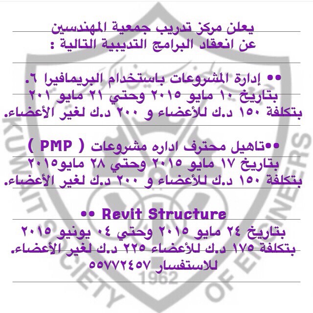 يعلن مركز التدريب جمعية المهندسين عن إنعقاد البرنامج التدريبيه 06/05/2015 الإعلانات الرئيسية, البرامج التدريبية Tags: جمعية المهندسين الكويتيةمركز التدريب Share 0