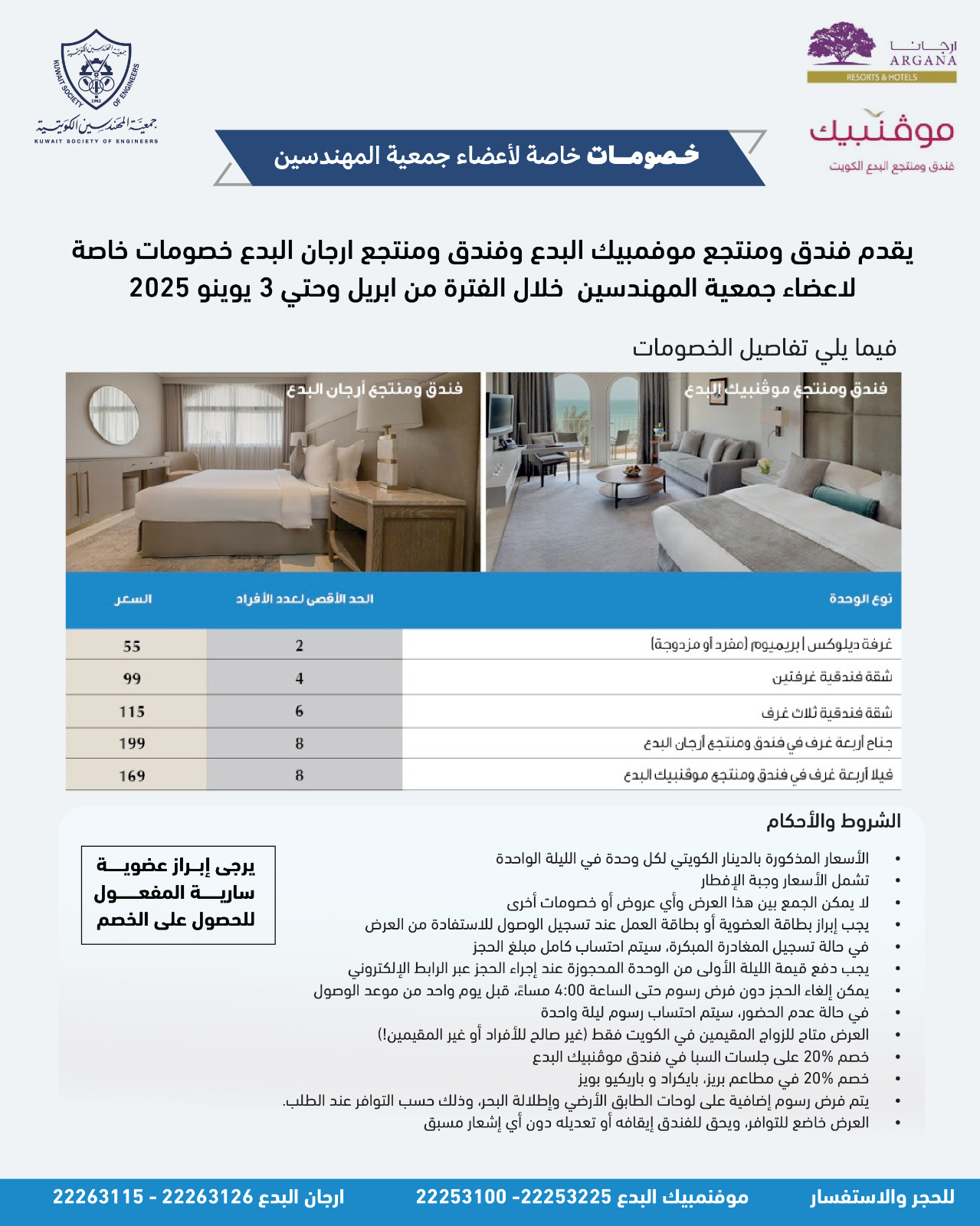 يقدم فندق ومنتجع موفانبيك البدع وفندق ومنتجع ارجان البدع خصومات خاصة لاعضاء جمعية المهندسين الكويتية 17/04/2025 العروض و الخصومات Share 0