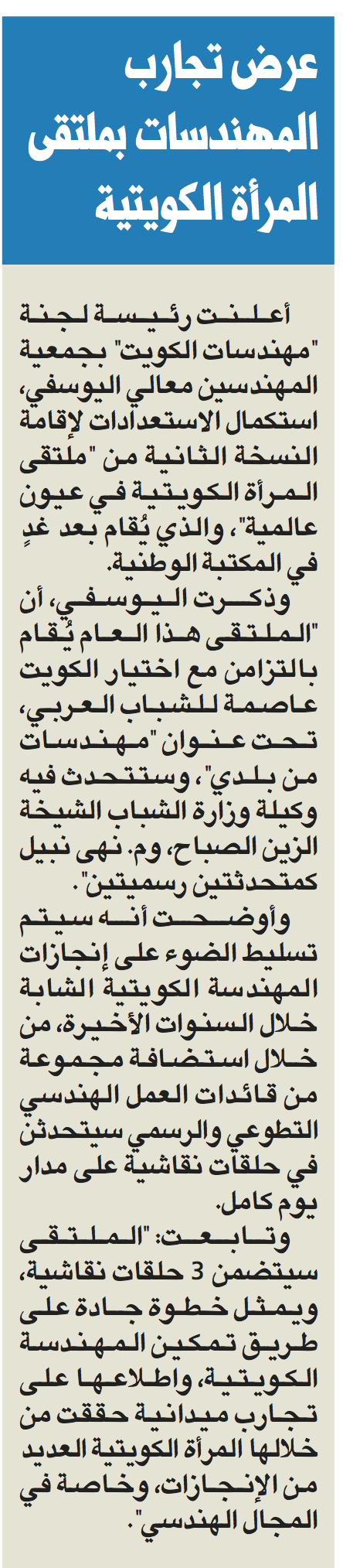 جريدة الجريدة 29/10/2017 أخبارنا بالصحف Tags: جريدة الجريدةجمعية المهندسين الكويتيةم. معالي اليوسفييوم المرأة العالمي Share 0